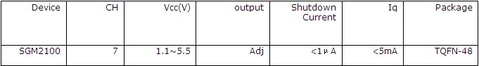 SGM2100的工作電壓為1.1~5.5V,具有以下優(yōu)點:輸入電壓低至1.1V;輸出電源多達7路;兼具升降壓DC/DC;1.1V升壓轉(zhuǎn)換效率在2A負載的情況下可以達到90%;降壓DC/DC通道,負載在1A條件下,效率可以達到90%;LED驅(qū)動具有過壓保護功能;DC/DC開關(guān)頻率高達1MHz;7路輸出單獨控制,關(guān)斷模式電流低至1μA;具有軟啟動、電源狀態(tài)指示和過載保護功能。